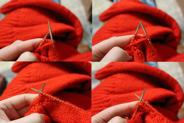Выполняем плечевые швы. Поднимаем по вырезу горловины 292 петели (круговые спицы №3). Вяжем резинкой 2*2 следующим образом: провязываем резинкой петли вдоль одной полочки и спинки, разворачиваем работу,делаем накид, следующую петли перекидываем на правую спицу, провязываем петли вдоль спинки+ 4 петли вдоль полочки, снова разворачиваем работу, делаем накид, перекидываем петлю на правую спицу, провязываем петли спинки+4 петли (накид провязываем вместе со следующей за ним петлей).