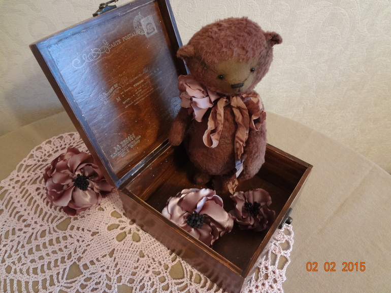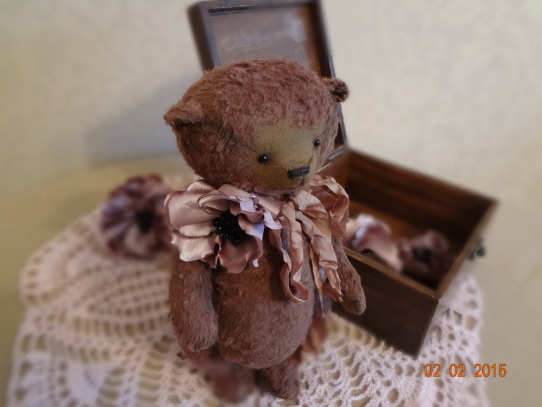 Игрушечный мир - животныеСегодня появилась новая девочка Ульяша ростиком 21см. Сшита из немецкой вискозы,набита плотно опилочками,утяжелена стальным гранулятом. На шплинтовом креплении,голова на двойном качается.Глазки стекло. Украшена мишка шебби лентами и красивым цветком.Тонирована маслом и пастелью.