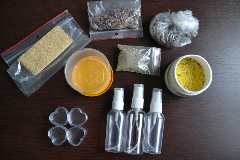 Люфа, жемчуг для ванны, сухоцветы - чебрец, лаванда, василёк; баночка 125мл, бутылочки 30мл, баночки для бальзама для губ в виде сердечка.