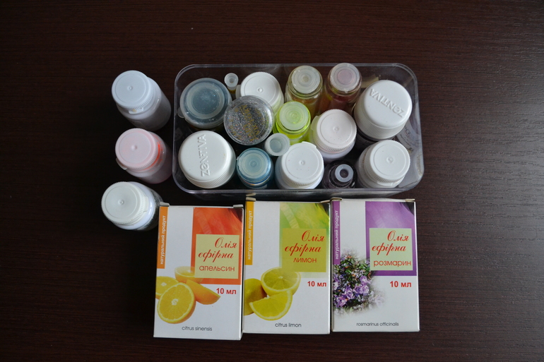 Красители тоже начатые, но их хватит надолго (я занимаясь мыловарением более 2х лет и половины не израсходовала), цвета: флуорисцентные - оранжевый, зелёный, розовый, желтый; перламутры: синий, сиреневый, золотой, серебряный, винный, зелёный, розовый, жидкие - синий и фиолетовый, диоксид титана и блёстки - золотые, серебряные, синие.