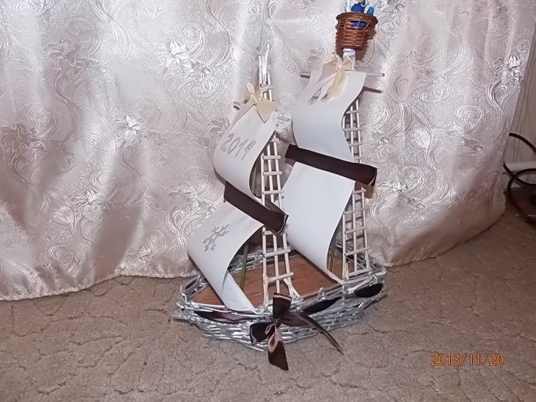 В создании этих корабликов двигало мной стремление принять участие в местом конкурсе новогодних поделок. Видела где-то на просторах интернет фотки кораблей из газетных трубочек, то так как с техникой плетения я не знакома, то пришлось фантазировать самой. вышло не очень аккуратно, но зато участие в конкурсе все-таки приняли и подарки получили. Старались с моей маленькой помощницей не зря