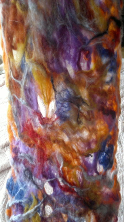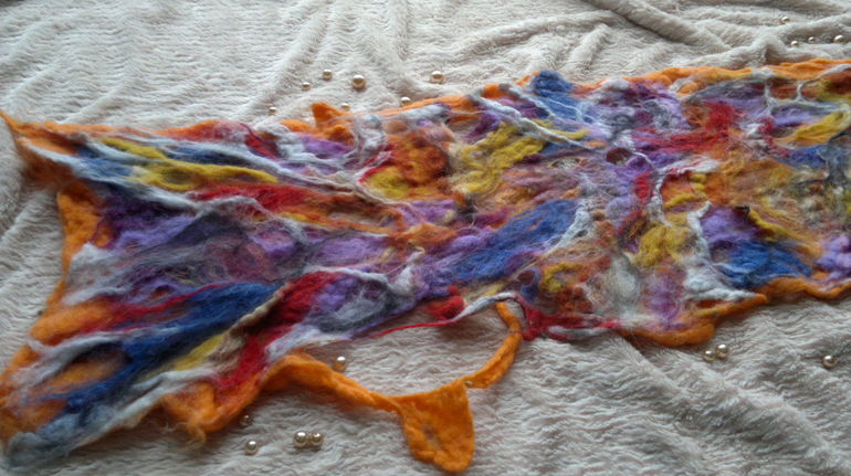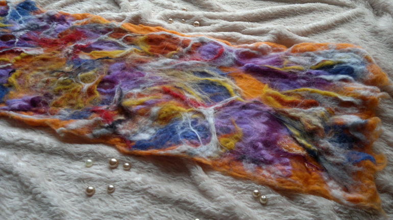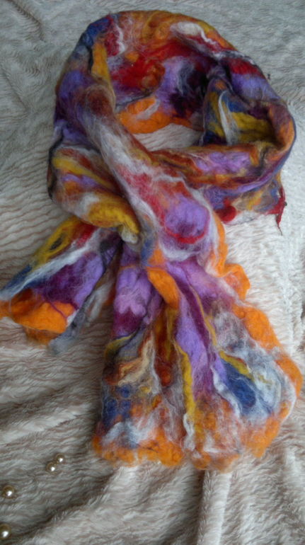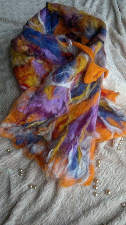 Авторская ручная работа. Шарф-палантин «Весенние брызги» изготовлен из 100%-ной шерсти в технике мокрого валяния.
