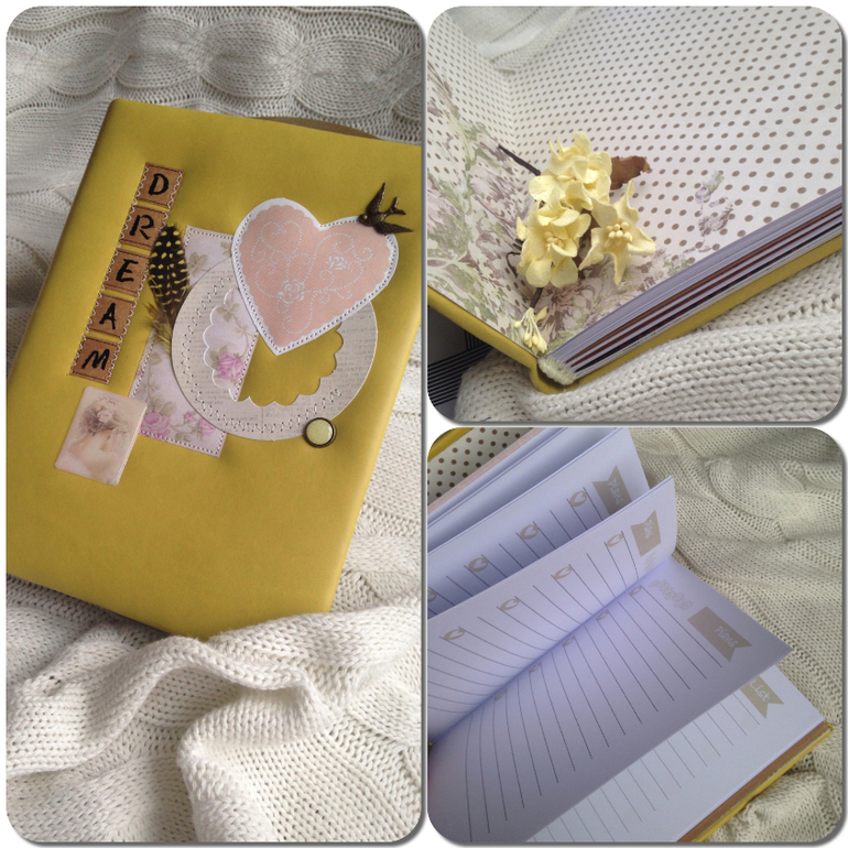 2. Блокнот в мягкой обложке из кожзама. Внутри странички с моим индивидуальным дизайном. Страницы разлинованы и есть разделы (планы, идеи, список книг для прочтения и тд), также я добавила листы крафт-бумаги есть вставки скрап-бумаги