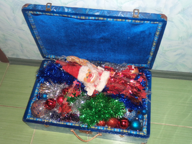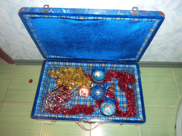 Нашла я чемодан. Давно у меня была идея сделать для елочных игрушек чемодан. До сегодняшнего дня они хранились в обычной картонной коробке из под хлебопечки. И вот он нашелся:
