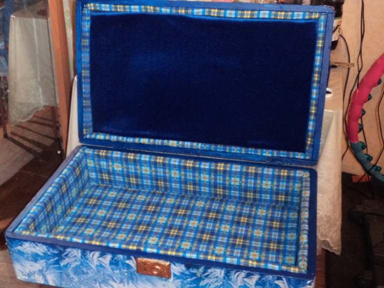 Сверху тоже самой но дно другой тканью. Да, кстати дно внутри чемодана ничем крепить не стала. Оно село достаточно плотно. А вот верх крышки закрепила на двусторонний скотч