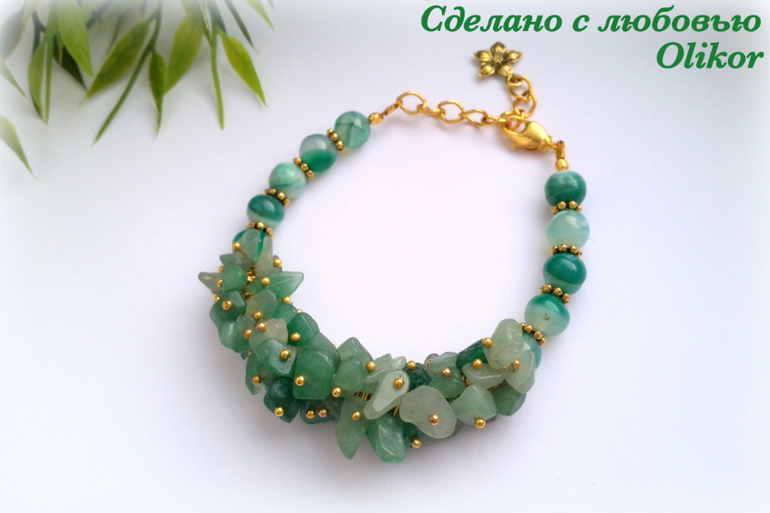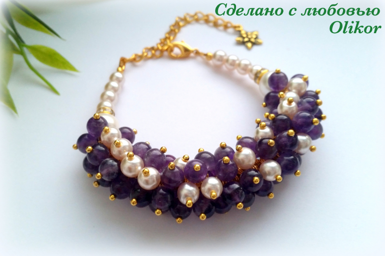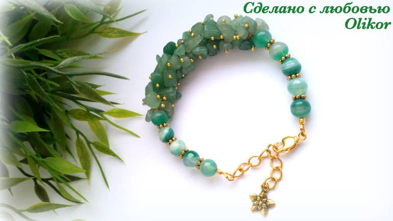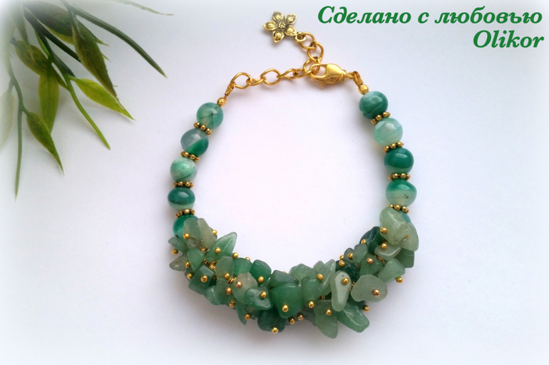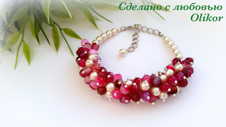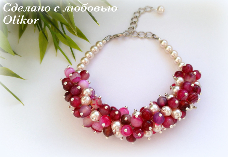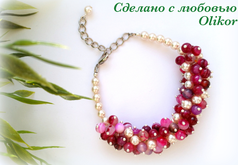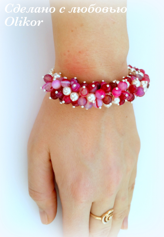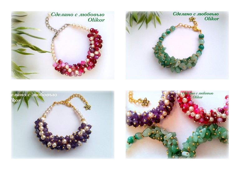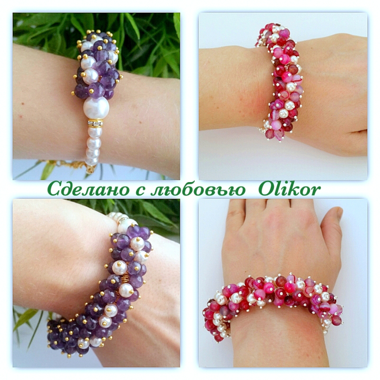 Розовый браслет с тонированым агатом и искусственным жемчугом, зеленый с агатом - круглые бусины и крошка камня, фиолетовый - аметист и искусственный жемчуг. Зеленых сделала два - один поменьше, один побольше.