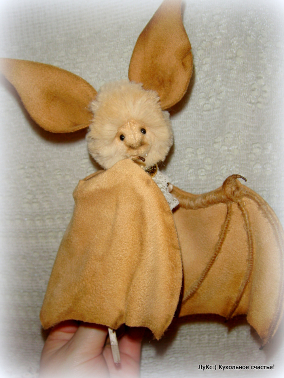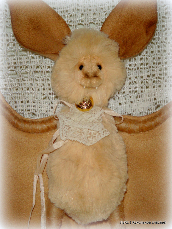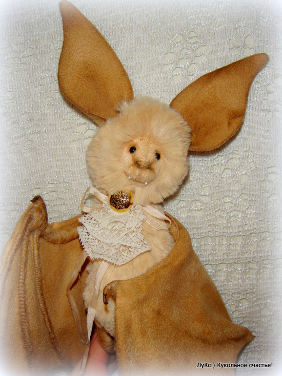 Тело из мягкой вискозы, голова на двойном шплинте, ноги-руки на проволочном каркасе, обмотаны шерстью, крылья и ухи из нежной замши (иск.), на ощупь как настоящие))) Жабо из старинного кружева и пуговицы. Тонирован маслом и пастелью.
