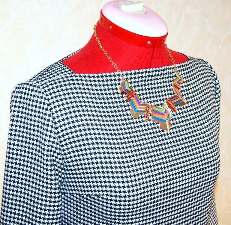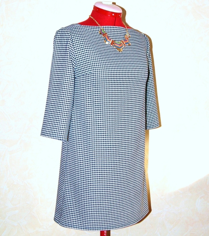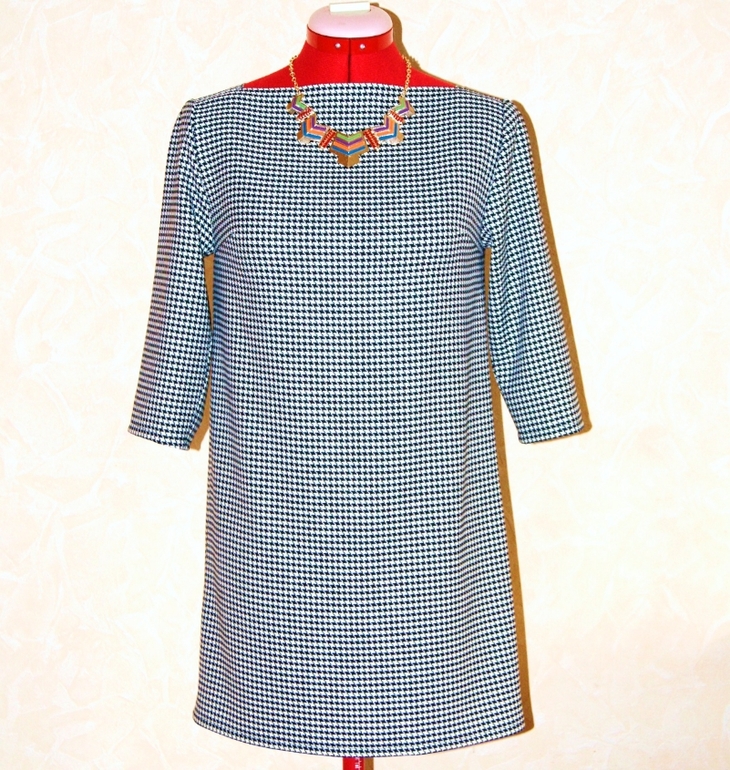 Вот и я сшила платье свободного силуэта из мягкой, приятной ткани "Гусиная лапка" (состав: вискоза, эластан), сделала треугольные плечевые вставки, которые придают изделию шарм и кокетливый вид, рукав 3/4.