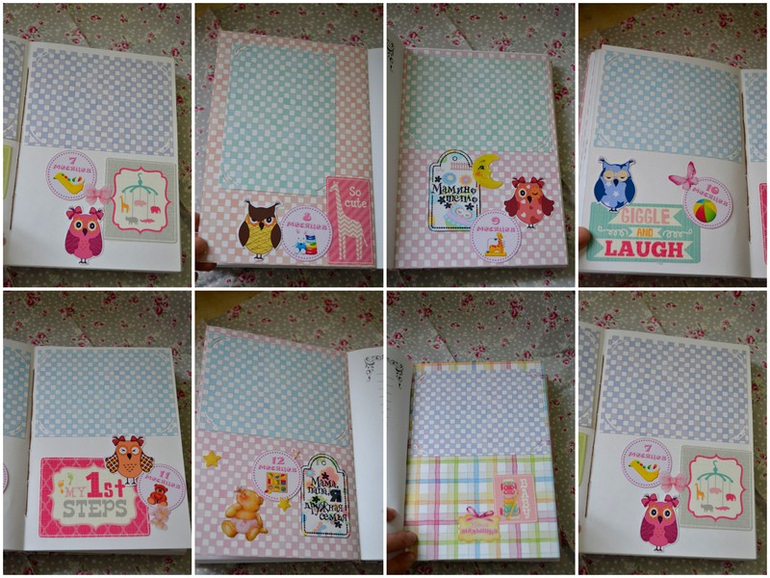 много места для фото и записей о малышке- эпоксидные наклейки- указатели по месяцам- графики веса ,роста.