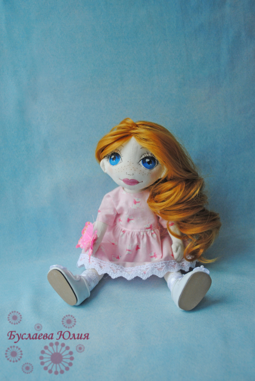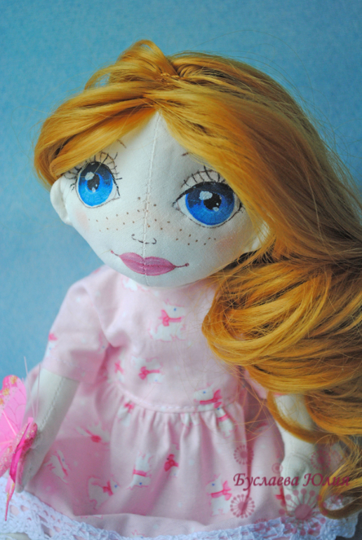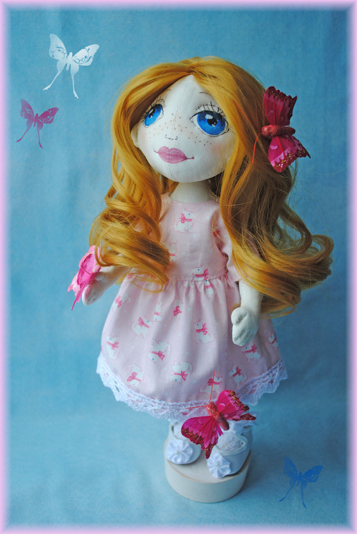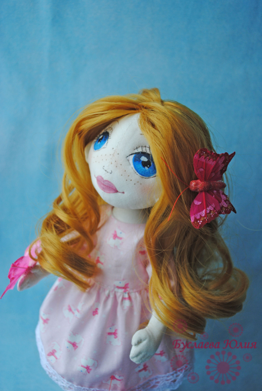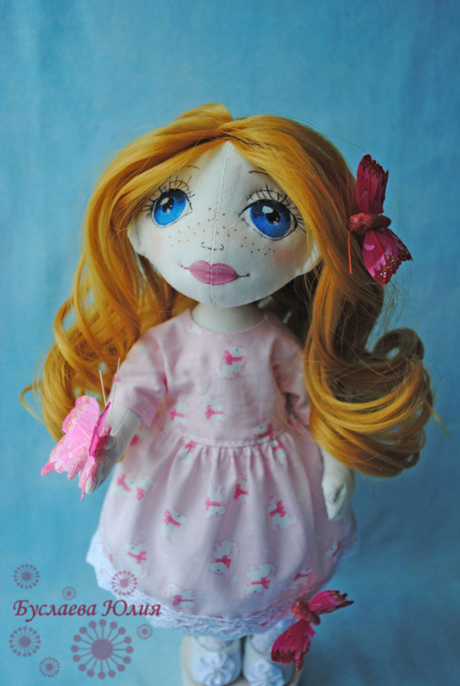 Захотелось сделать трогательную и нежную девочку с бабочками. Вот и получилась у меня рыжая Мишель. Одёжкой нагружать её не стала, поэтому одета она в нежно-розовое простое платьице.