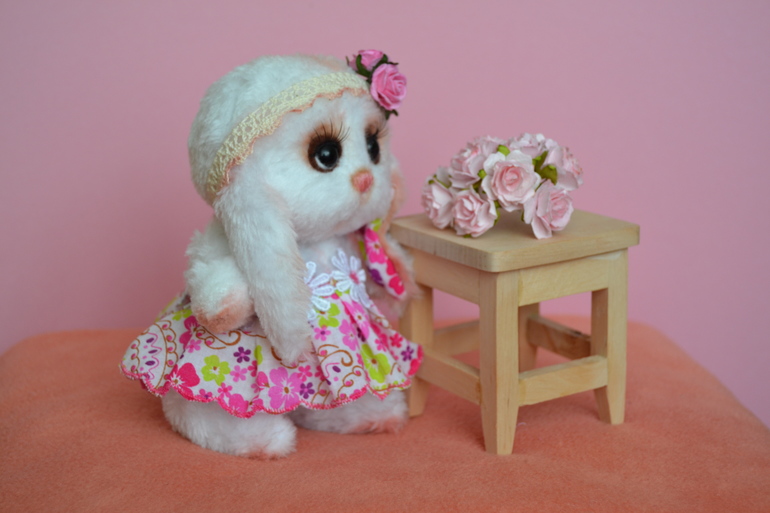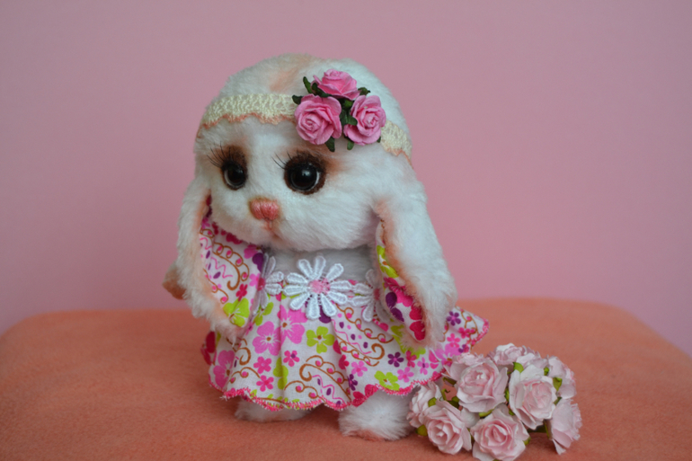 Игрушечный мир - животныеЗаюшка сшита из искусственного меха. Рост 16 см. Приятно тяжеленькая. Глазки - немецкое стекло. Полностью подвижна, головка на двойном шплинте. Может стоять и сидеть. Тонирована пастелью. Одежка сшита из хлопка, снимается. На голове хлопковая ленточка, тоже тонирована, с бумажными цветочками.
