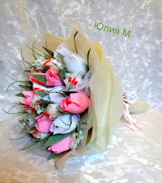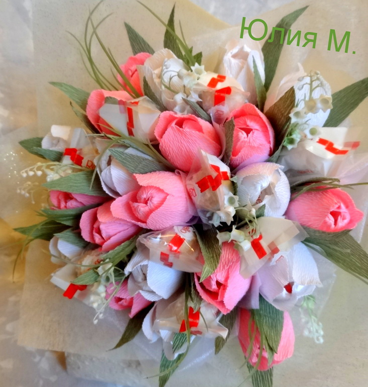 Юля, супер букеты, такие сочные и яркие!!! я вот решилась такие подарки в садик и на занятия сделать, и туплю, там ножки просто связаны или в одну сходятся?