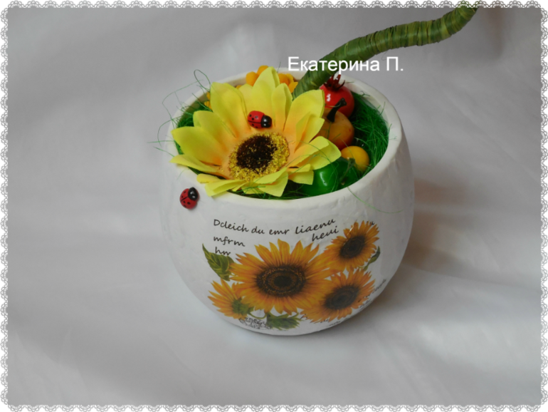 Спасибо, Катюш! Мне себя самой сложно оценить )))Показывай подсолнушковый))) Наверняка, солнечная красотища! А я вчера аж 3 ведерка купила витажных ( 1 из них с подсолнухами ). Разорилась (((( но устоять не смогла...