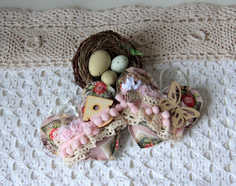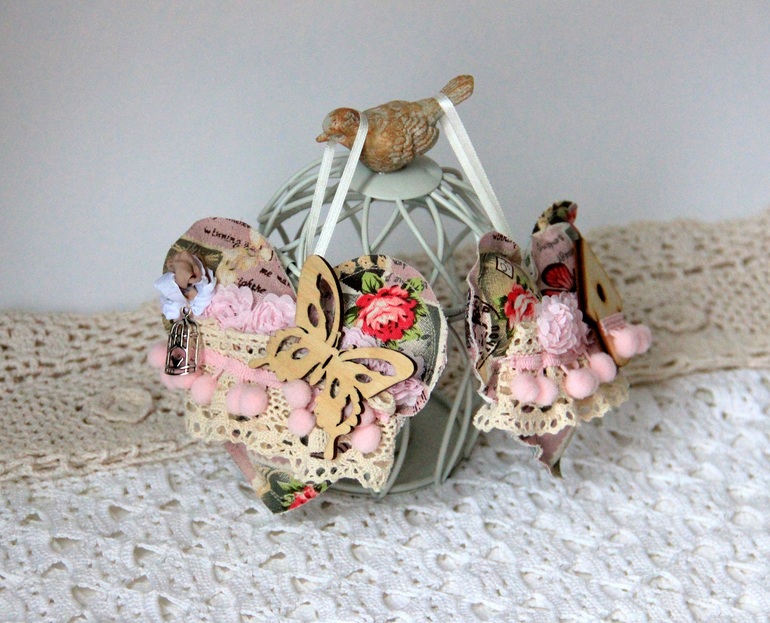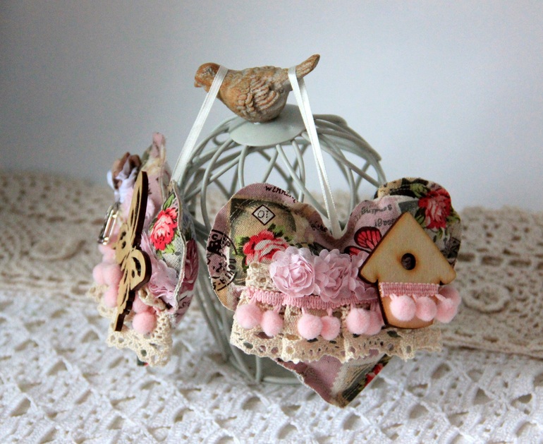 Декор, витражи.Интерьерные подвески в форме сердца сшиты из плотного льна, украшены хлопковым кружевом и шебби-лентами. Цветы из ткани и бумаги, подвески и сладости из полимерной глины, деревянная вырубка - декора в стиле шебби много не бывает)))
