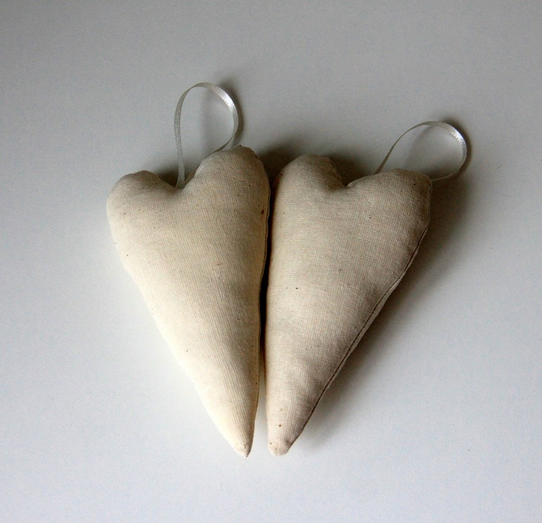 Один момент - я прошиваю по всему контуру, отверстие не оставляю. Вырезаю, вспарывателем (или ножничками) прорезаю на одной стороне отверстие и выворачиваю через него. Тогда сердечки получаются ровные. Набиваю плотно. Отверстие зашиваю, закрываю кружевом. Вот такие заготовочки у нас получатся:
