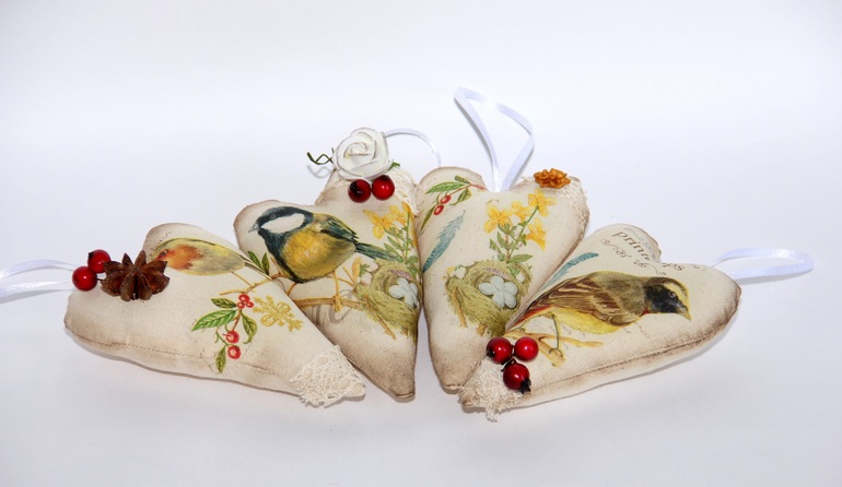 Хочу показать, как я декорирую Тильда-сердца при помощи салфеток для декупажа и клея ПВА.