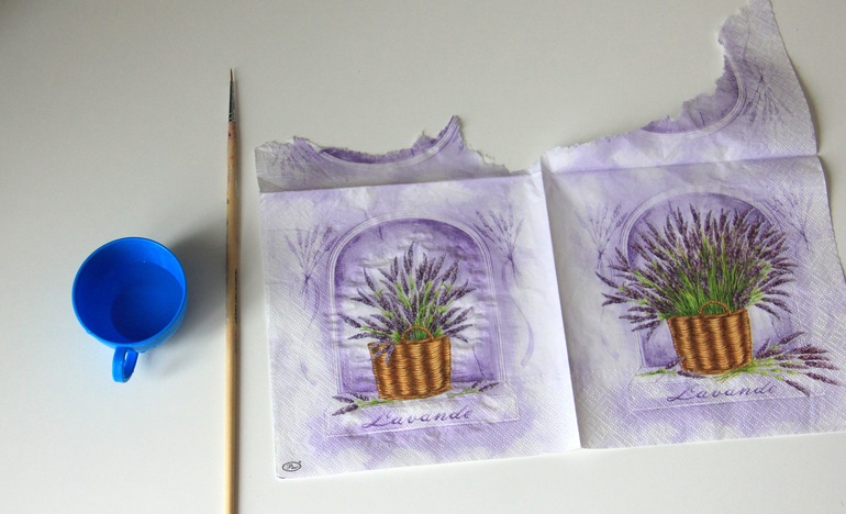 Я выбрала лаванду - прованс, как-никак))) Макаю кисть в воду и обвожу вокруг мотива, полный контур. Тут же беру в руки и вырываю мотив из салфетки. Деликатно и осторожно)))
