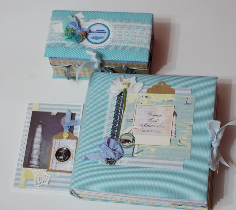 СкрапбукингВсем привет! Мой первый мальчуковый альбом в морском стиле! Давно мечтала сделать подобный. До этого было много девочек) И в комплект шкатулочка "Мамины сокровища". Осторожно,много фото!)