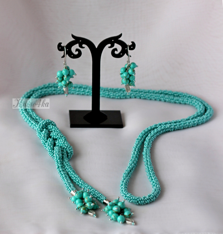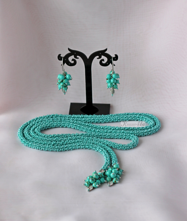 Комплект состоит из лариата и пары серёг. Использованы чешский бисер, хлопковая пряжа, бусины бирюзы, фурнитура под серебро.