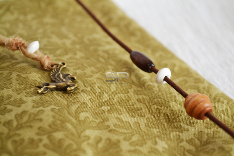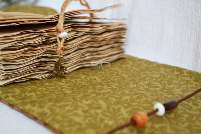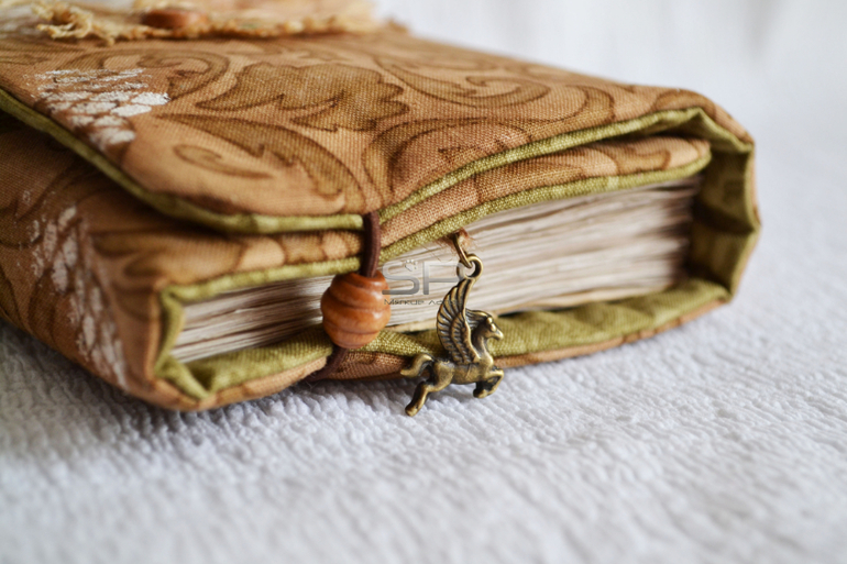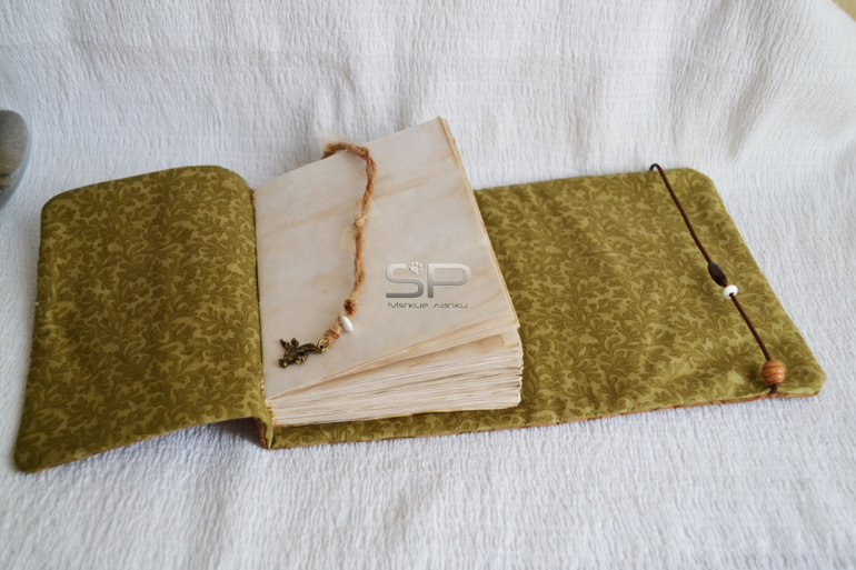 Закрывается софтбук на резиночку с деревянными бусинами. На закладке металлическая подвеска.