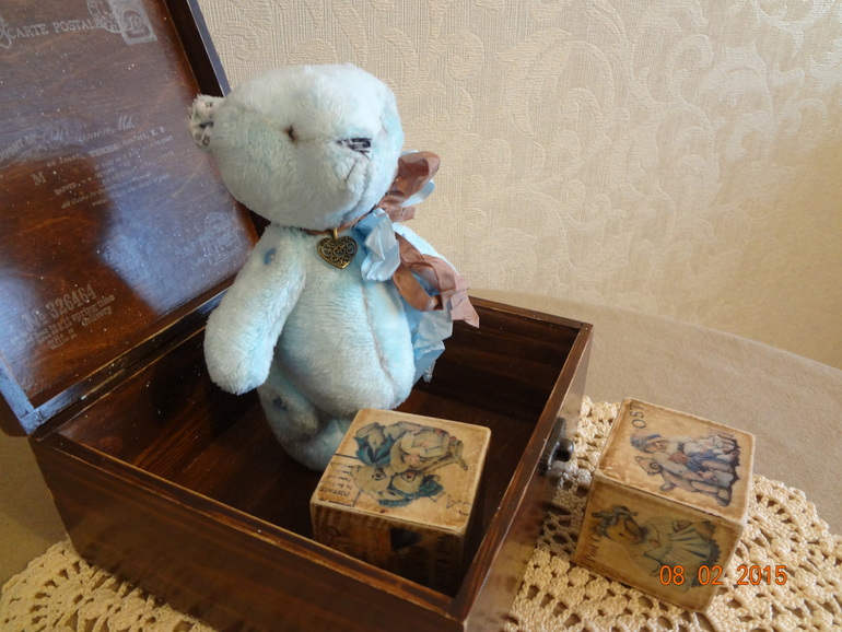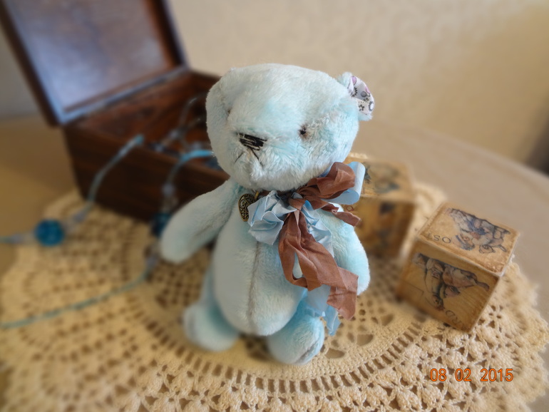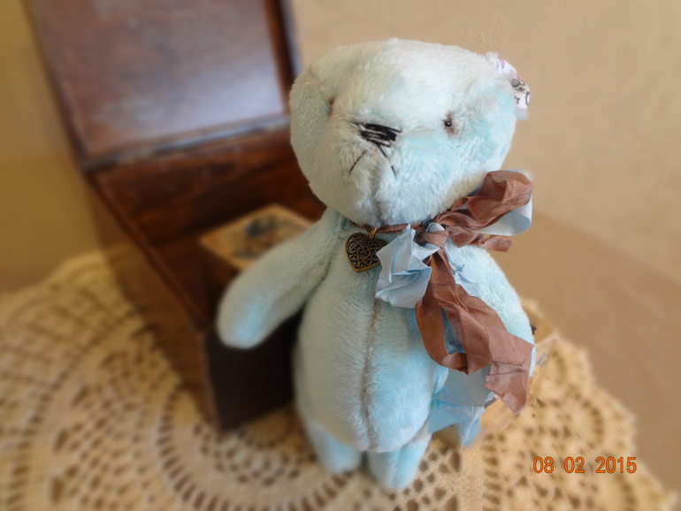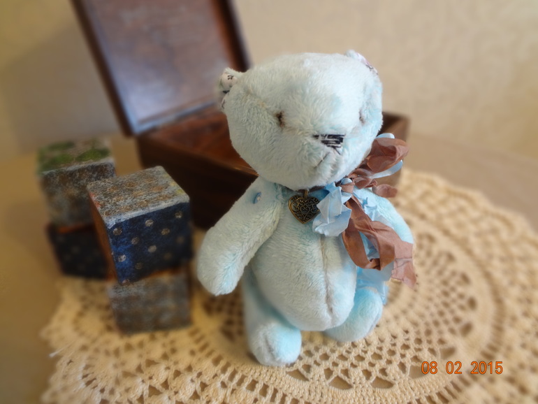 Игрушечный мир - животныеВот такой вот малыш родился сегодня. Ростик 16см. Сшит из мягонького плюша,приятный на ощупь. Набит плотно синтепухом,утяжелен стальным гранулятом,хоть и маленький ,но имеет внушительный вес,сидит устойчиво.стоит с поддержкой. Голова на шплинтовом креплении,ручки и ножки на пуговичном. Глазки бусинки. Тонирован слегка пастелью.Украшен шебби лентами и подвеской сердце.