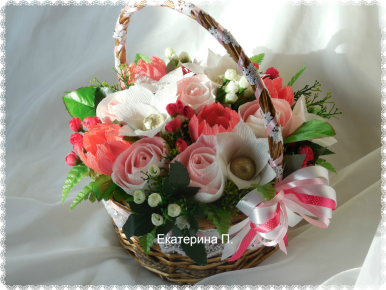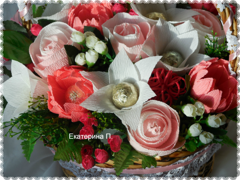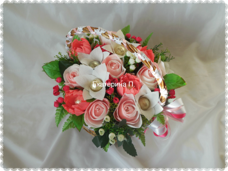 Катя, корзина просто прелесть. Я если честно занялась плагиатом. Делала букет на заказ. Уже сделала половину цветов, поехала за бумагой, а нужных цветов нет. Вообще никаких нет, кроме зеленых и синих.Чуть не ревела. Отчаялась, все бросила. Просто села смотреть ленту. Увидела Вашу работу. А у меня и бумага такая есть в остатках. И вроде должно хватить. Получилась такая красота, что отдавать не хотелось.Спасибо, что вы, сами того не зная, просто спасли ситуацию.PS Такие розы делала первый раз. А цветочки типа пионов сделала другими, т