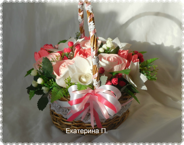 Катя, очень красиво получилось. Ну, сиреневый букет — это вообще моя любовь, а корзина — ну нежность из нежностей, и все таки она не совсем розовая, а скорее в нежно-абрикосовом цвете, что еще прекраснее!