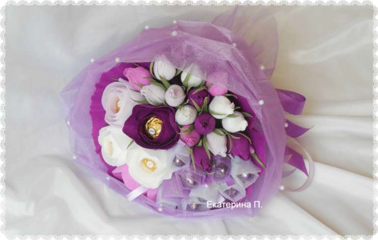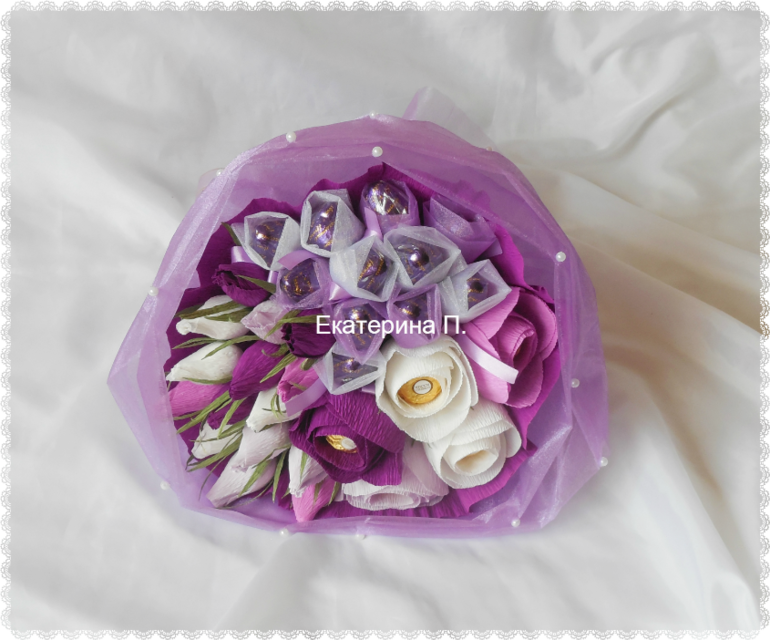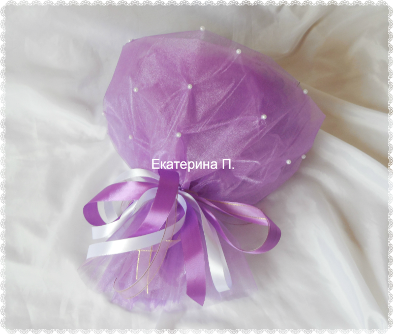 А еще в эту субботу проходил день встречи выпускников в школах. Нашему выпуску исполнилось 15 лет ))) Для классной руководительницы сделала ручной букетик. Раньше делала такой в красно-белой гамме, а теперь хотелось в сиренево-белой )))