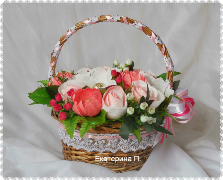 Я редко делаю корзины, но в этот раз выдался заказик ))) Хотелось нежности после насыщенных сердец, поэтому композиция получилась розово-белая )))