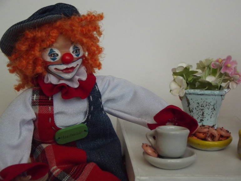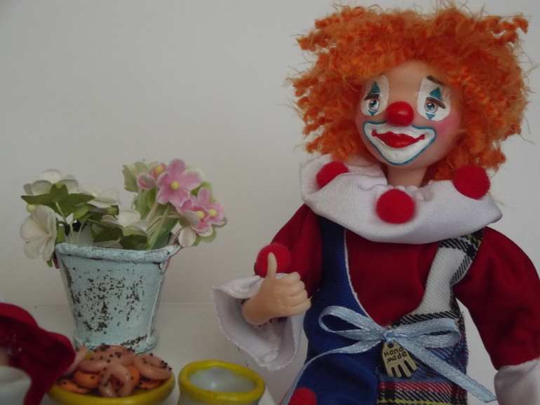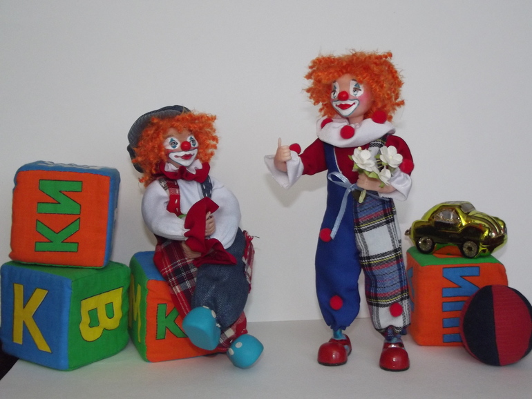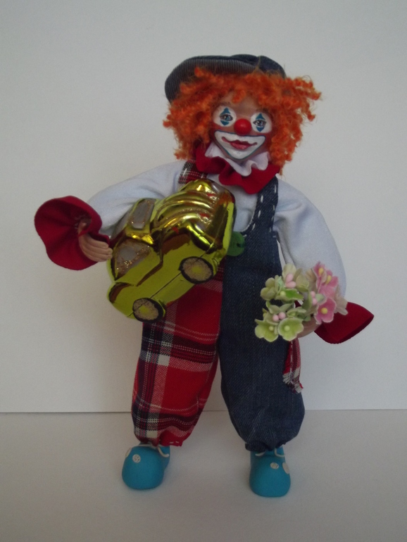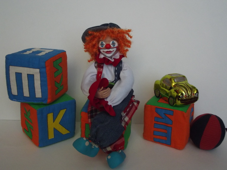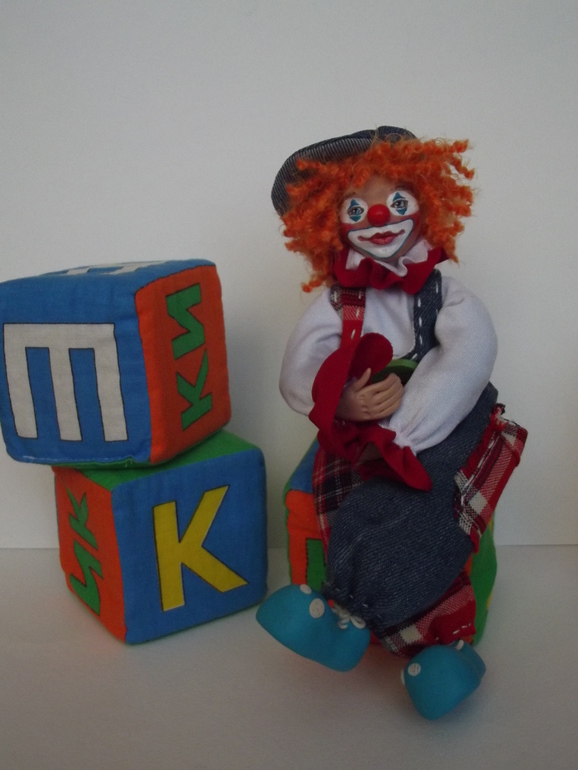 Клоун Скромняшка, ростиком 23 см, ручки, ботиночки и голова слеплены из пластики. Тело на каркасе, поэтому он как живой! Кепка и букет всегда при нем!