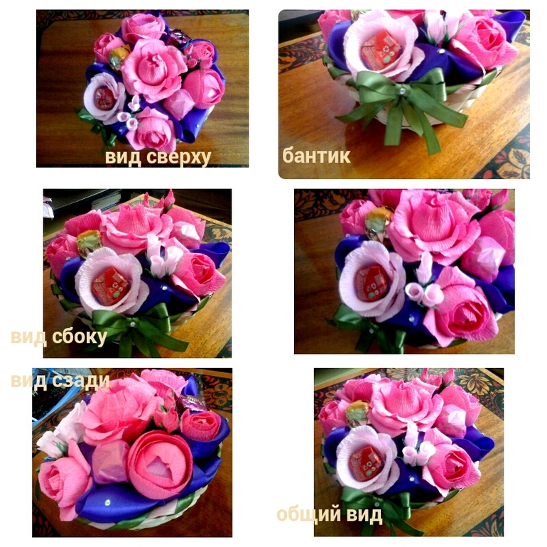 Наверное, вместо фиолетовой ленты было бы хорошо темно-зеленые фунтики. Бутончики маленькие, без конфеток, вместо конфеток крупные бусины, но в следующий раз возьму конфетки. Буду благодарна, если подскажите недорогой магазин, где можно будет купить необходимые мелочи! Спасибо за отзыв!