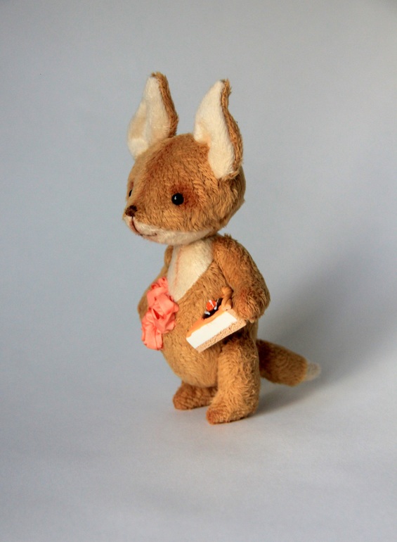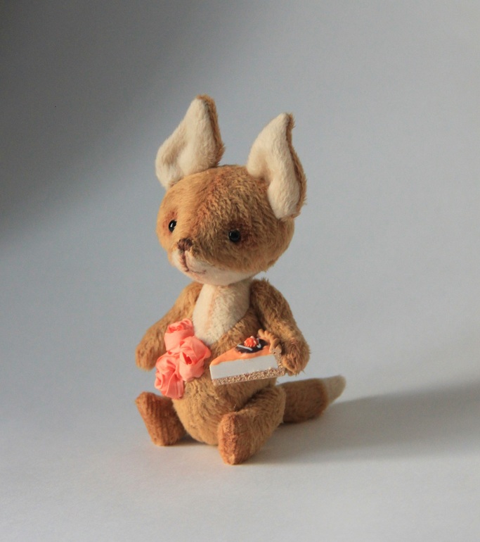 Игрушечный мир - животныеПлюшевый малыш 12 см. ростом сам стоит на коротеньких лапках)) Пузо в шебби-розочках оранжевого цвета, в лапке апельсиновый чизкейк - ммм, вкусно))) Лисенок умеет сидеть, лапки подвижны. Размер "в руку" делает его очень трогательным.