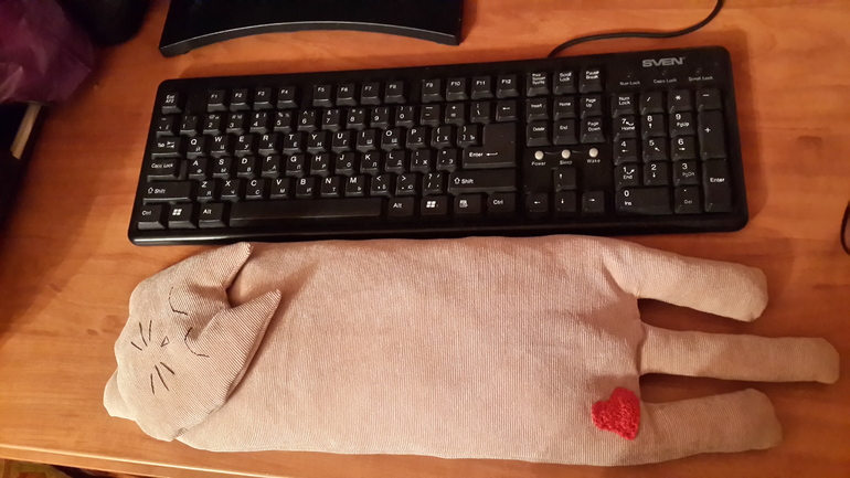 Игрушечный мир - животныеВ подарок мужу, который много работает на компьютере, сшила котика-подушку, чтобы руки не так уставали.