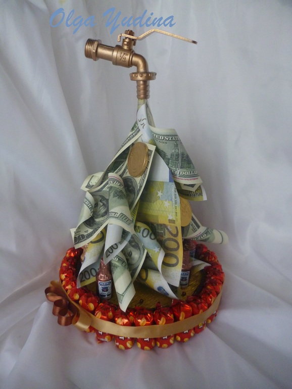 И кран денежный,конфетки,конечно,тут не в тему,но надо было куда-нибудь их пристроить,пыталась завернуть в купюры,они меньше размером и смотрятся дурацко,нужно,наверное,было лучше в гофру хотя бы обернуть,или ещё как задекорировать?