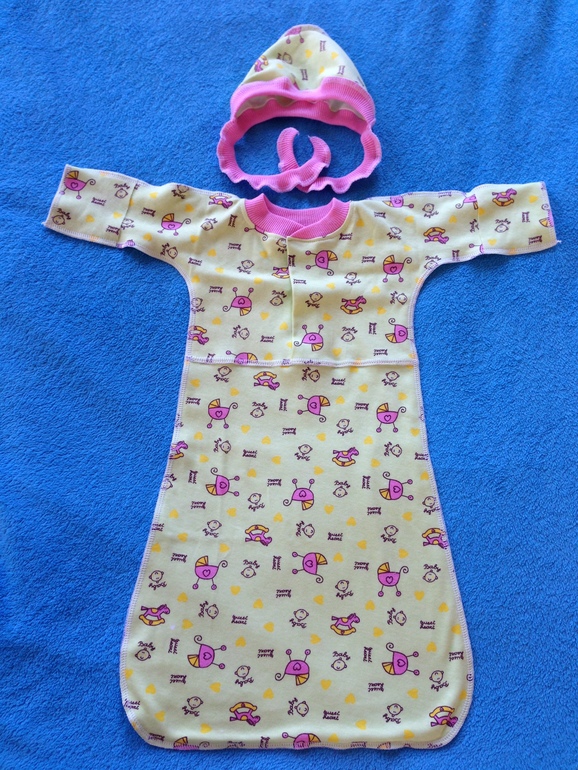 Шитье одежды, выкройки, ремонт одежды, шторы, швейные машины (уже приобретенные)Слипик и шапочка для новорожденной малышки . Моя ошибка в том, что застежка короткая, одевать приходилось с низу натягивая.