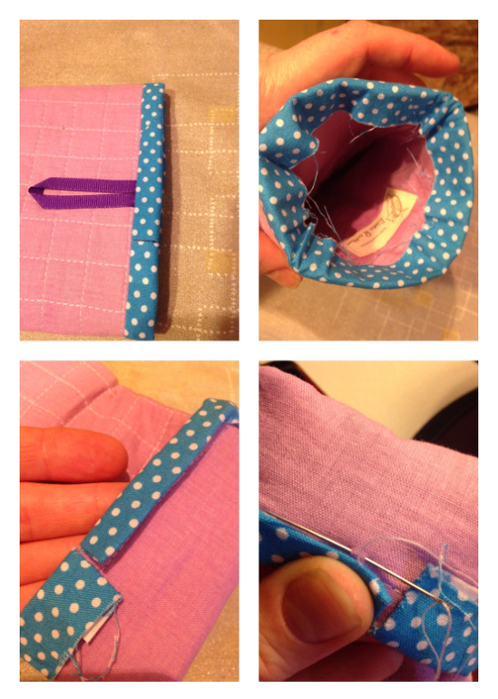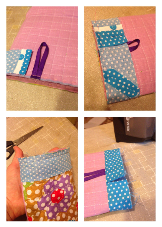 Тут я решила что прихватке нужна петелька и приметала кусочек репсовой ленточки.
