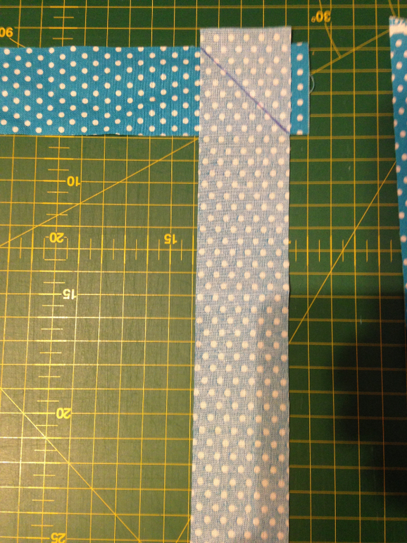 Если собираем из кусочков, складываем полоски вот так)) припуск имеется, видите? и вот по этой линии, по диагонали, сшиваем, разутюживаем и радуемся прямым рукам