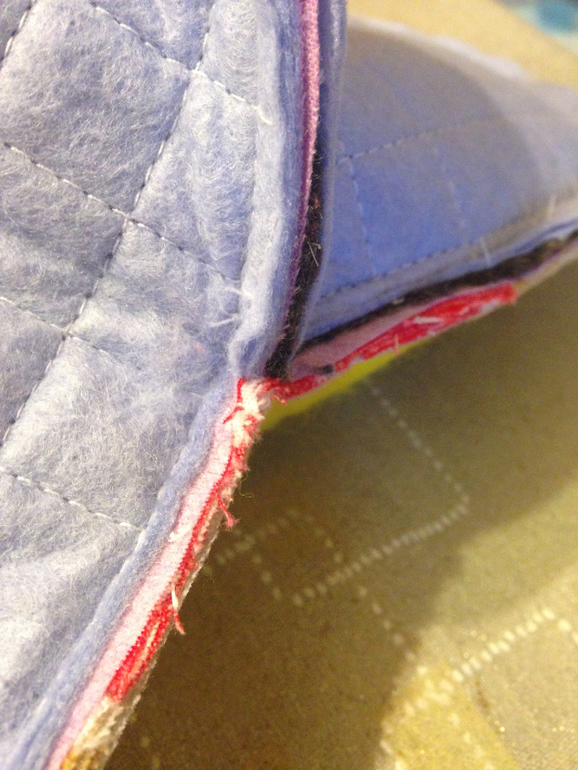 Сшиваем по краю. Вручную. Швы я не разутюживала, а просто раздвинула в стороны и в таком положении сшила. Вот тут видно какая толщина на шве, если уплотнитель не срезать, то будет бугор и машинка может не захотеть строчить такое.