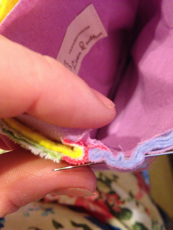 Потом берем тонкую иголку и заворачивая край, потайным швом пришиваем окантовку к изнанке.