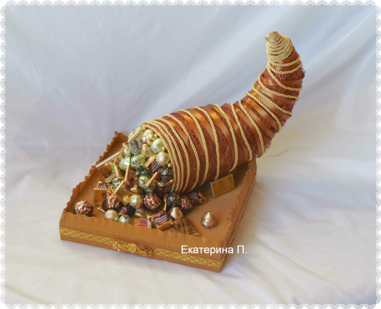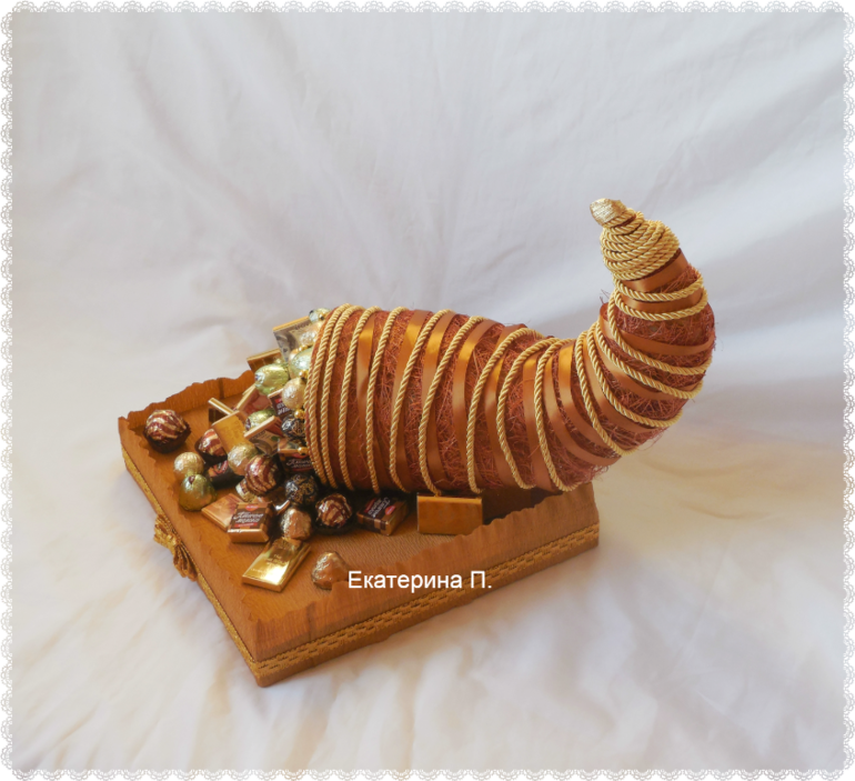Катюха, ну убила - букет из трусов! Какая прелесть! Я тут как-то случайно по телеку увидела, как дамам один мужик подарил розы из женских трусиков. Можно тоже попробовать сделать. Рог изобилия шикарный, я пока только мечтаю о таком заказе. Умничка-рукодельница :-)