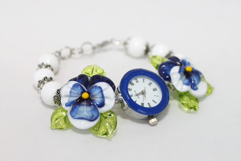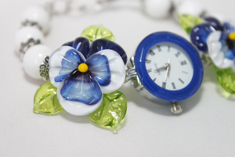 4. Часы "Анютины глазки" бело-синие. Металлофурнитура под серебро, кварцевый механизм, авторский лэмпворк, агат