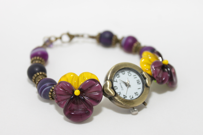 5. Часы "Анютины глазки" фиолетово-желтые. Металлофурнитура под бронзу, кварцевый механизм, агат, авторский лэмпворк