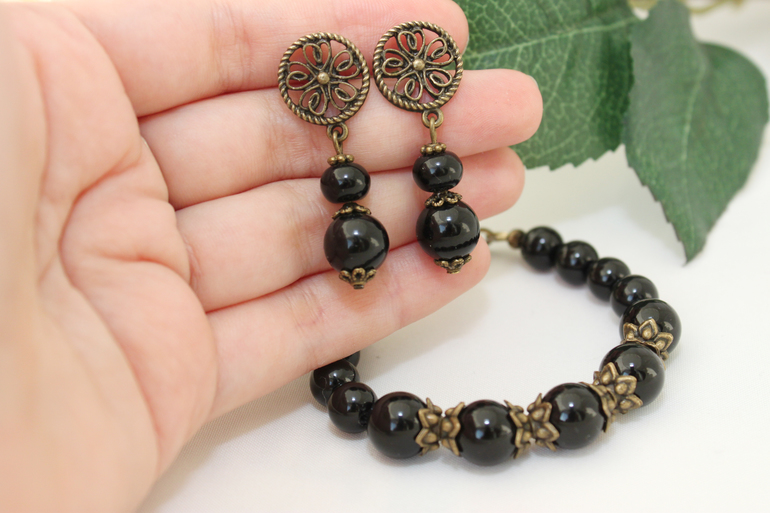 6. Комплект из агата "Черная ночь" Фурнитура под бронзу, агат. Размер браслета от 15 до 18 см, регулируется