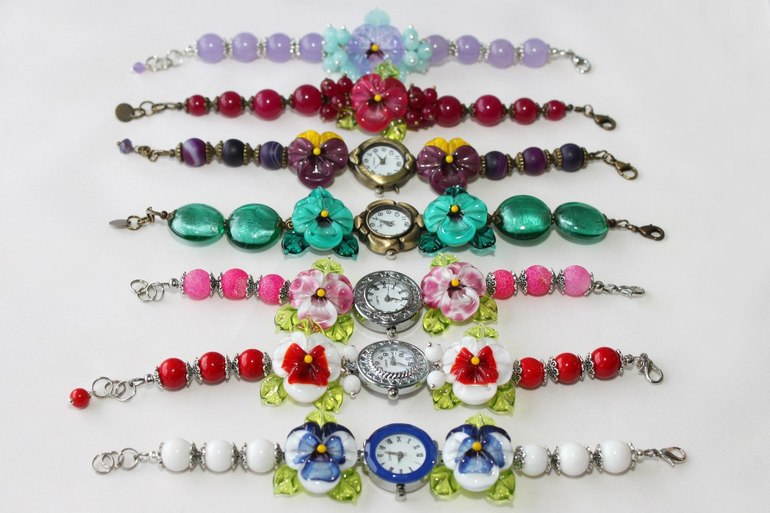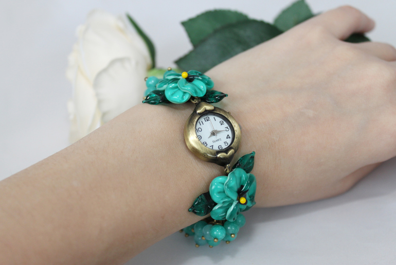 1. Часы "Анютины глазки" (мятные) Фурнитура под бронзу, тонированный нефрит, авторский лэмпворк. Размер регулируется