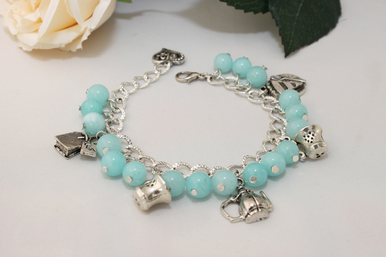 8. Браслет "Чайная церемония" Фурнитура под серебро,подвески,тонированный нефрит. Безразмерный