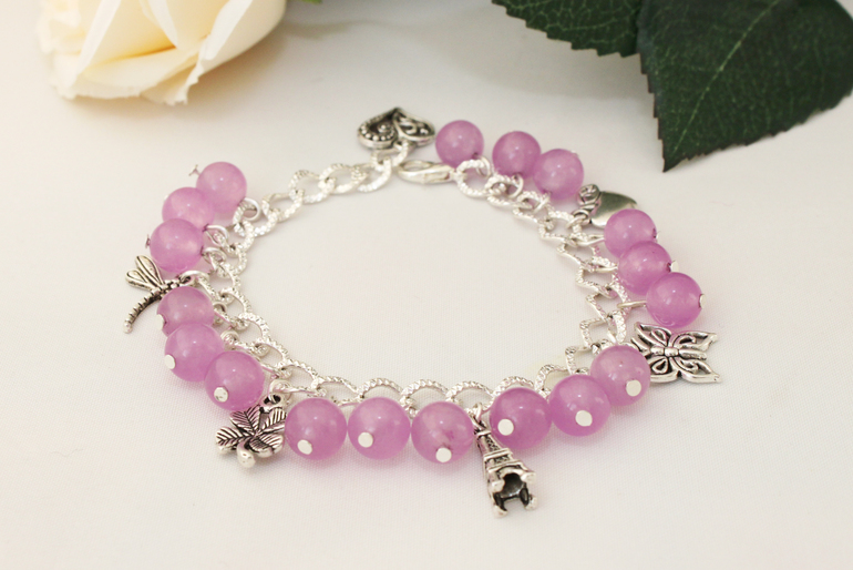 7. Браслет "Сирень" Фурнитура под серебро,подвески,тонированный нефрит. Безразмерный