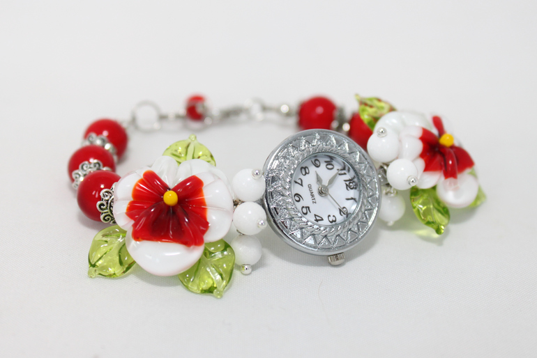 3. Часы "Анютины глазки" бело-красные. Металлофурнитура под серебро, кварцевый механизм, авторский лэмпворк, агат, коралл прес.
