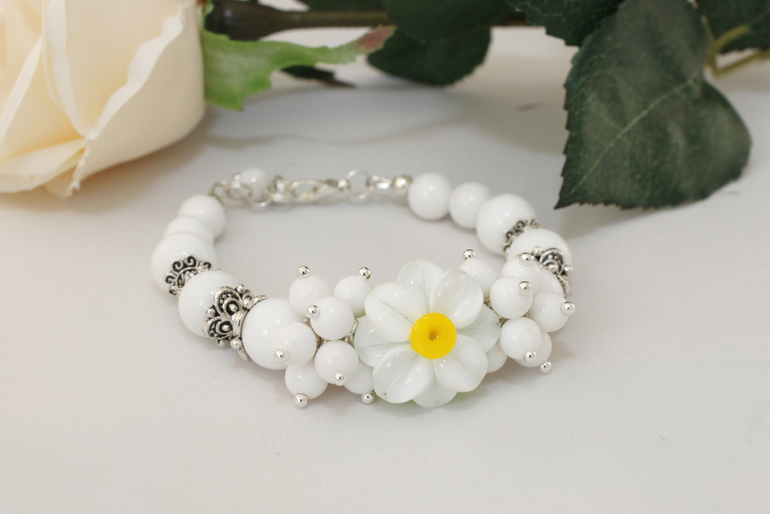 2. Браслет "Ромашка" Фурнитура под серебро, авторский лэмпворк, агат. Размер от 15 до 18 регулируется