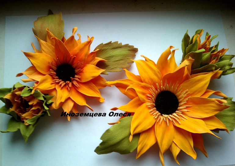 Это мои подсолнухи из фоамирана .Один большой один чуть по меньше.