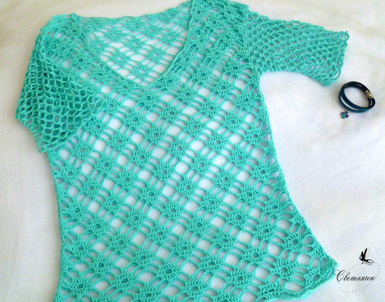 Добрый день! Джемпер чудесный получился, да и цвет Вам подходит!Имхо под него больше подойдет маечка телесного цвета,так еще выигрышнее фактура и рисунок.